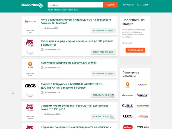 Промокоды, коды и купоны на скидки интернет-магазинов Покупать все необходимые товары и существенно экономить деньги из семейного бюджета – это ли не мечта каждого покупателя? Все люди хотят приобретать только самые лучшие и качественные детали гардероба, стильную обувь, модные аксессуары, а также окружать себя только самыми надежными и безопасными предметами бытовой техники. Вот только денег не всегда хватает, а покупка некачественных и дешевых косметических средств, одежды или бытовой техники не только не позволит сэкономить, но и может принести вред здоровью. Для того чтобы тратить меньше денег, и экономить не за счет качества или количества, следует использовать бесплатные купоны и промокоды. Ведь большие скидки в интернет магазинах – это не сказочный миф, а настоящая реальность!