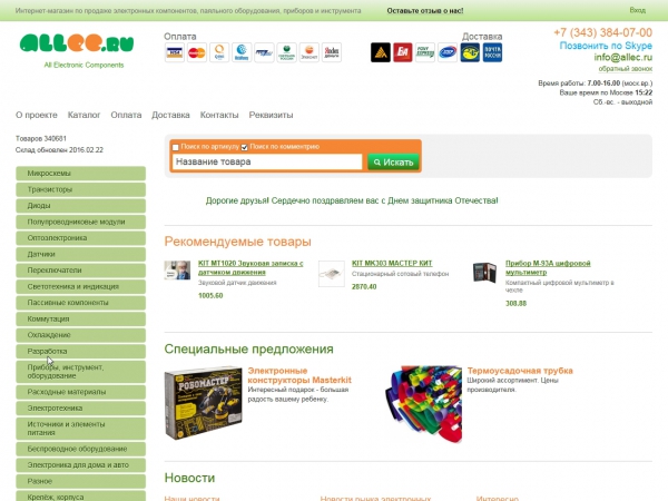 Интернет-магазин Allec.ru – это большой выбор приборов, инструментов, оборудования, расходных материалов, электротехники, электроники для дома и авто, оригинальных электронных гаджетов. Очень выгодные цены для оптовиков. В каталоге представлены микросхемы, транзисторы, диоды, полупроводниковые модули, оптоэлектроника, датчики, светотехника и индикация, пассивные компоненты, оборудование для коммутации и охлаждения, термоусадочные трубки и многое другое. Мы предлагаем товары от разных поставщиков в одном месте, с сохранением минимальных цен. При заказе через интернет-магазин — скидка 5%. Работаем с физическими и юридическими лицами