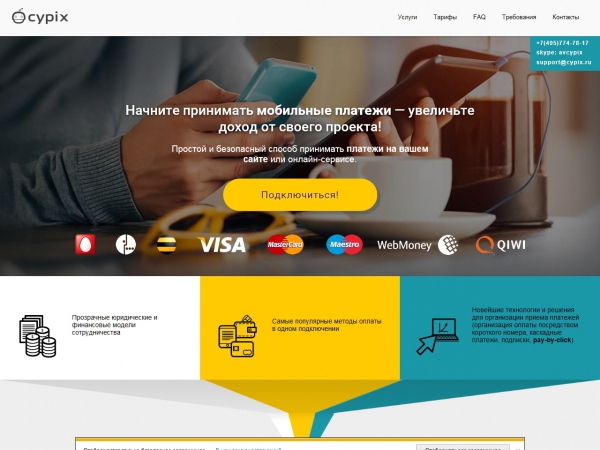 | Платежный агрегатор Cypix.ru предоставляет удобное решение для приема платежей на любом сайте. Доступно более 30 способов оплаты через одно подключение и один договор. Карты VISA, мобильная коммерция, кошельки. Все расчеты выполняются через банк. Выплаты осуществляются на ваш счет ежедневно. В короткие сроки согласуем ваш проект в любой платежной системе. Гибкая система распределения комиссий, реальные тарифы в зависимости от категории вашего ресурса. Выплаты на сайте, рекарринговые платежи. |