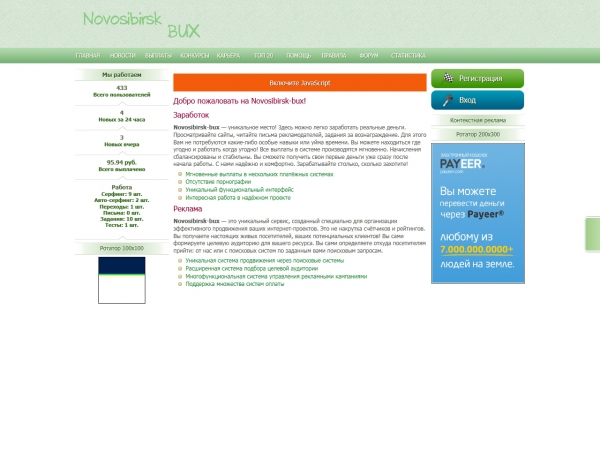 Приветствуйте новую систему продуктивной рекламы novosibirsk-bux! Она представляет собой отличный источник дополнительного заработка. Вам не нужна квалификация или же специализированные знания: нужно только посещать сайты, решать увлекательные тесты и несложные задания, а также прочитывать письма рекламодателей. За всё это платятся настоящие деньги. Вы можете быть где угодно, а работать - в любое время. Заработок можно вывести автоматически при помощи любой известной системы сразу же, поскольку мы установили самый низкий порог для вывода суммы. У вас нет никаких ограничений, а только лишь полная свобода действий. Вы можете зарабатывать сколько угодно!