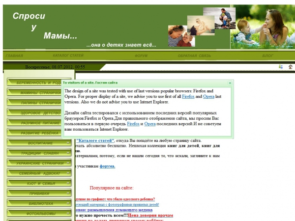 | Сайт посвящён темам беременности, рождения, воспитания и развития детей, здорового образа жизни семьи и гармонии отношений, традиций древних славян и украинских традиций в воспитании. Затрагиваются вопросы и проблемы вакцинации. Размещены тексты русских и украинских стихов для детей, потешек, колыбельных, много примеров развивающих игр, и масса статей на самые популярные темы воспитания и развития. Для родителей подобраны статьи специалистов в области косметологии, психологии, юриспруденции. |