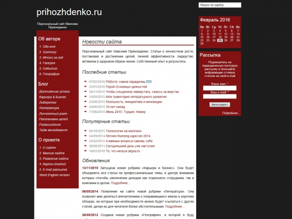 | Блог Максима Прихожденко о личностном росте, постановке и достижении целей, раскрытии потенциала, успехе и полноценной жизни. Цель автора сайта - достичь в этих направлениях высоких результатов самому, миссия сайта - привлекать к ним интерес других. Опубликованные статьи разбиты на рубрики, отображающие соответствующую тематику, но в совокупности они приобретают единый смысл – как стать тем, кем ты можешь быть. |