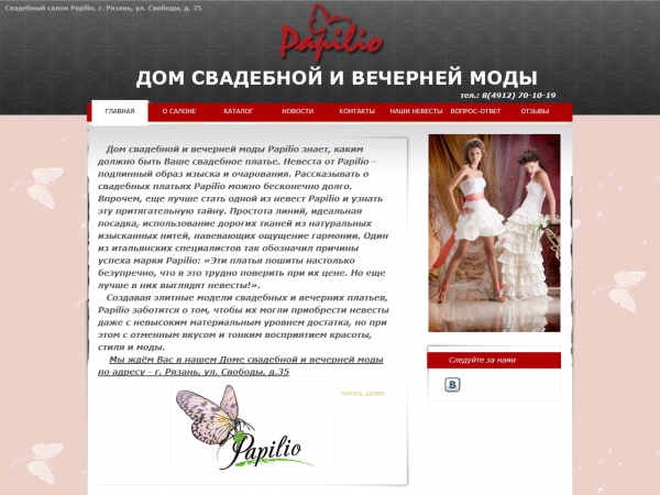 Дом свадебной и вечерней моды Papilio, Рязань - один из немногих, работающих непосредственно от производителя. Интересные дизайнерские решения платьев восхищает даже самую капризную и требовательную невесту, а богатство и разнообразие тканей превращает каждое платье в неповторимый шедевр. Большой выбор аксессуаров ( шубки, накидки, перчатки, митенки, колье, диадемы и др.) поможет завершить образ, сделать его законченным. Элитные модели свадебных и вечерних платьев Papilio - это отменный вкус и тонкое восприятием красоты, стиля и моды.