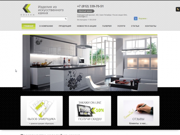 | Компания "Koskam" - огромный выбор изделий из искусственного камня по доступным ценам. Наша компания предлагает Вашему вниманию индивидуальные интерьерные решения, способные придать изюминку Вашему дому, офису или ресторану. Вы можете заказать у нас изготовление изделий из искусственного камня таких как: столешницы, подоконники, литые раковины, мойки, барные стойки, ванны, мини-бассейны и многое другое. |